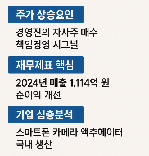 최근 이슈/상승 트리거: 10월 23일 상한가 및 VI 발동 기사, 경영진(대표) 자사주 매수 이슈 부각. 투자심리 개선 → 단기 수급 탄력.
