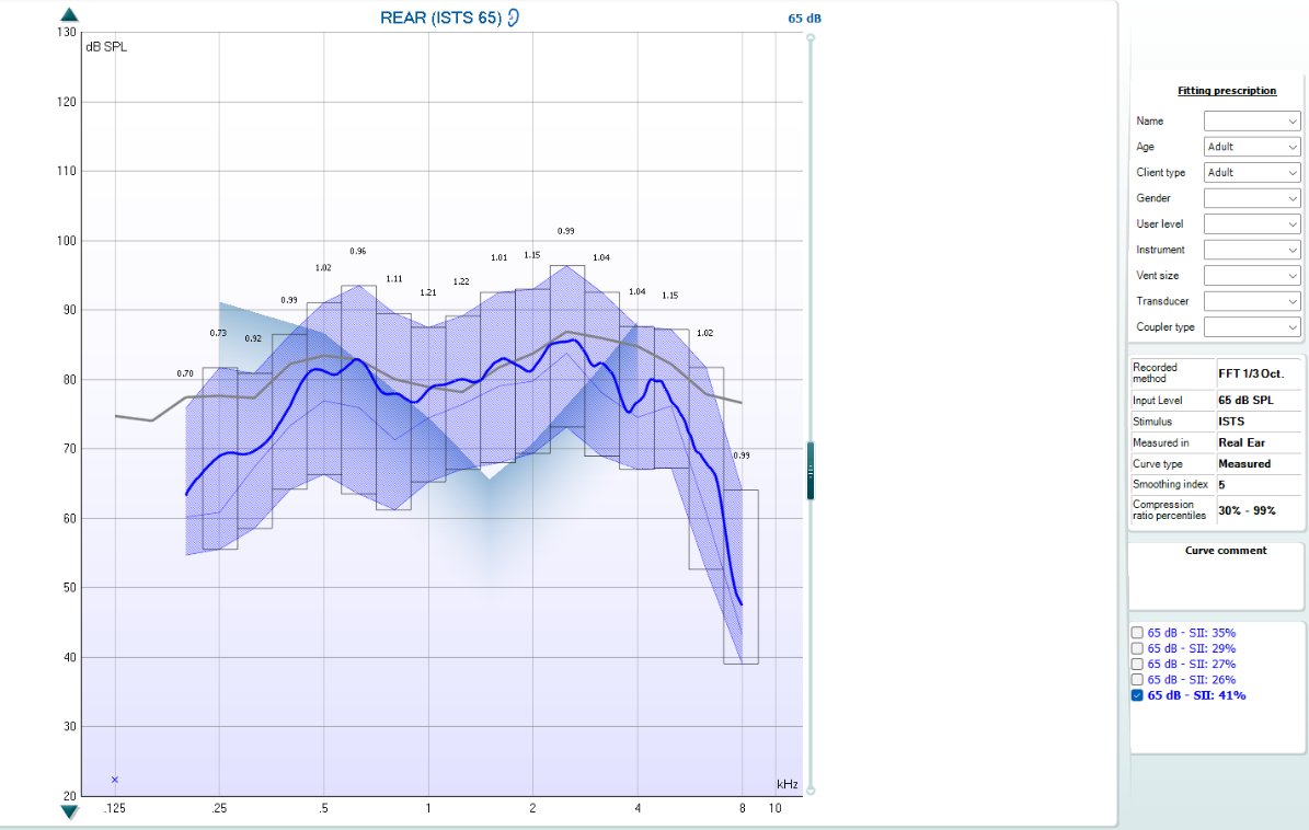 두 번째 그래프는 보청기 착용 후 실제 고막 앞에서 측정된 소리 (Real Ear Aided Response) 입니다.
